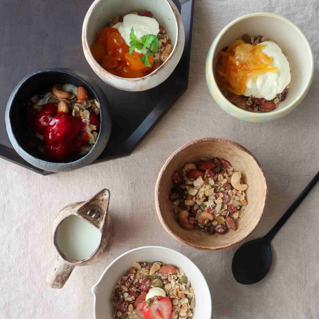10年ほど前、福岡で海の見える料理教室を主宰するYuko’s Dishさんが大切な家族のためにつくり始めた具だくさんのグラノーラ。食の多様化でライフスタイルは変化し、グラノーラも朝食として受け入れられつつも、食卓の道具にまで関心は寄せられていない。